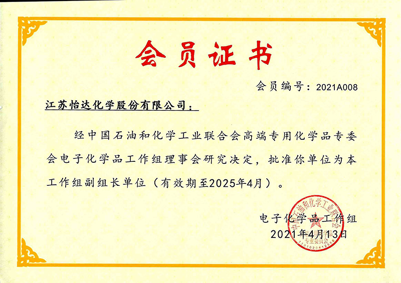 江蘇怡達被評為高端專用電子化學(xué)品組副組長單位